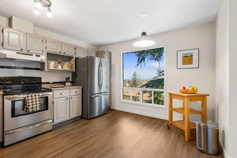 In search of long-term tenants. References required. Dog or cat negotiable and subject to condo board approval. Approved pets will be subject to a monthly pet fee and additional damage deposit.Please include a short letter of introduction when inquiring.  Bright reverse 2-storey townhouse with spectacular views and a double attached garage in the desirable community of Strathcona Park. This 2-bed townhome has been meticulously maintained, with new, contemporary vinyl flooring throughout the main level and freshly painted living space. The main floor offers functionality and versatility while maintaining a cozy atmosphere. The spacious living room has a cozy wood burning fireplace with custom mantle and raised hearth. Large eat-in kitchen with ample cabinets, stainless-Steel appliances and room for a comfortable breakfast table. Host your friends and family on all occasions: dine in the formal dining room with open pass to the kitchen or enjoy a meal on your deck overlooking the city. Primary level bedrooms with a large bathroom featuring a shower and jet tub, double sink vanity. The 2nd bedroom can easily be used as a home office and features sliders to the private patio. All rooms are above grade. Unfinished basement includes a brand new stacked washer and dryer (2024), a second washing machine for outdoor gear, and all the storage space you could need. Perfect for those wanting to store their outdoor equipment (skis, climbing gear, road bikes...etc.) or put together an in-home gym.15 min walk to Sirocco C-Train Station, 5 min drive to Westside Recreation Centre and all the abundance of amenities that Strathcona Park, Aspen, and West Hills have to offer - all while being only 15 min from downtown and 5 min from the new Stoney Trail Ring Road that takes you to the airport in 30 minutes. Easy exit from the city for those who like to escape to the mountains on the weekend. With the pathway system at your doorstep, it offers the option to cycle downtown, to U of C, or MRU. Great condo community with fantastic grounds team - lawn mowing and snow removal included.