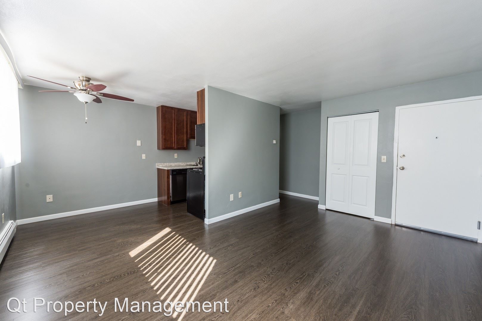 Gorgeous, fully remodeled 1-bedroom apartment featuring beautiful plank flooring in a rich wood-tone finish throughout apartment, updated functional kitchen with sleek wood cabinets and stainless steel appliances including dishwasher and built-in microwave. Great closet space. Modern color scheme with cool gray walls and contemporary white doors and trim.