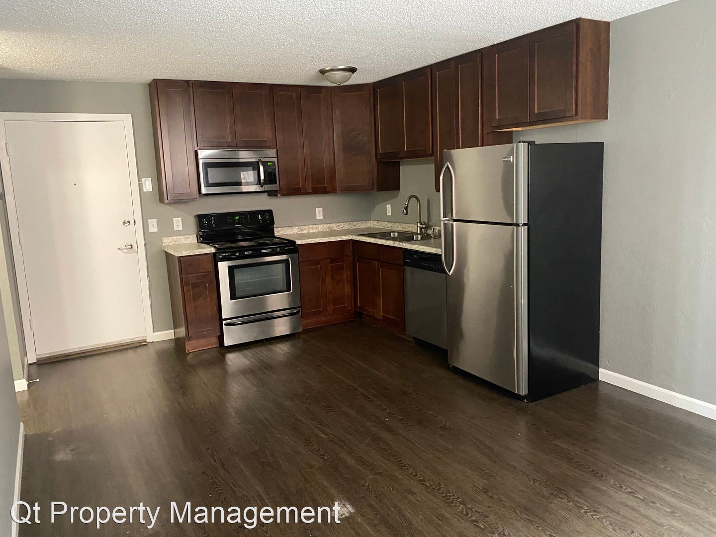 Gorgeous, fully remodeled 1-bedroom apartment featuring beautiful plank flooring in a rich wood-tone finish throughout apartment, updated functional kitchen with sleek wood cabinets and stainless steel appliances including dishwasher and built-in microwave. Great closet space. Modern color scheme with cool gray walls and contemporary white doors and trim.