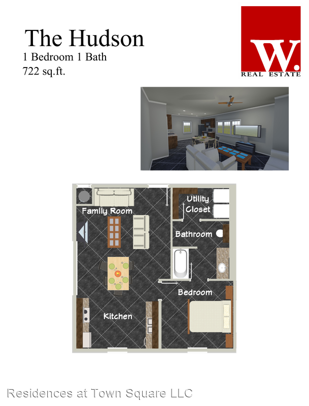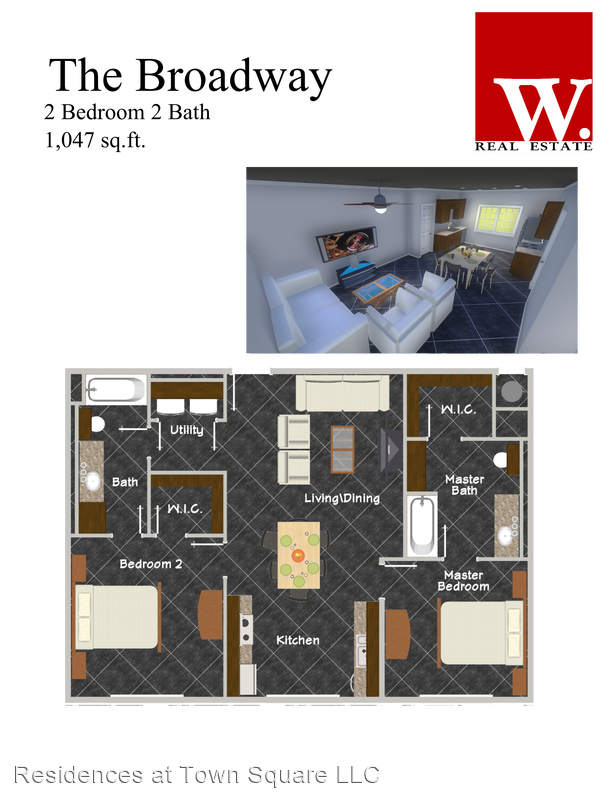 The Broadway - The Broadway offers the perfect layout for roommates. Both bedrooms and bathrooms are equally spacious, with one providing a guest access point in addition to the bedroom door. This functional layout offers 9 foot ceilings and stained concrete flooring. In addition, each Town Square Village lease comes with a membership to the nearby VERDURE health club and access to our exclusive W. Real Estate REAP program, which can allocate 20% of your monthly rent toward the purchase of a Bluehaven home, restrictions apply.